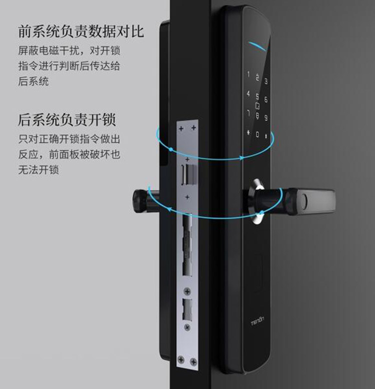 门里门外双控制系统,驱动开锁系统在后面板上,即使小偷破坏了前面板,也无法开启门锁,有效防电磁干扰解锁。
