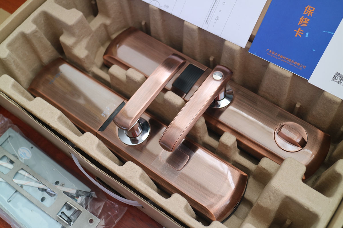 打开两个包装盒后可以发现,其他配件/附件等非常规整齐全。主包装盒内部并没有采用市面常见的严重污染环境的泡沫塑料进行固定,而是采用成本更高的定制化硬纸托固定,环保大气。前后两个智能门锁锁身也分别采用了无纺布进行包裹,拉开无纺布后能看到光洁的锁身。