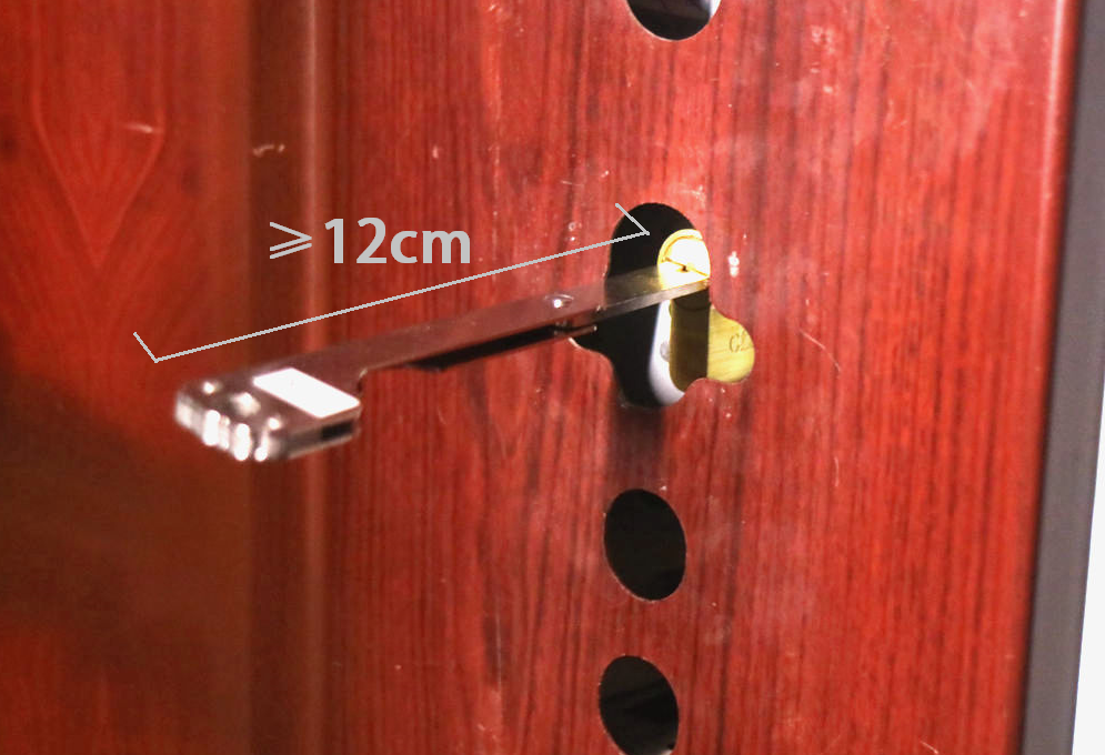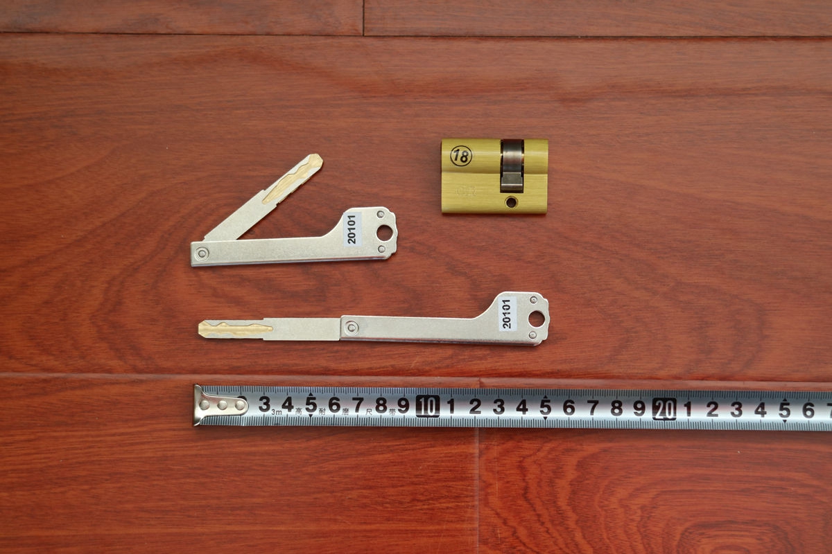 亚太天能T109的C级锁芯钥匙是其独有专利的长折叠钥匙,除了表面的双锯齿内铣槽,钥匙双侧面棱处也有不规则的铣槽,符合C级锁芯的高要求。这把钥匙折叠起来长度约为9厘米,展开后长度达到15厘米左右。我们驱动中国从这个长度推断,亚太天能的工程师为了做到尽可能安全,将这颗T109的C级锁芯在门锁的安装位置会隐藏地比较深,稍后我们会在安装后进一步验证。