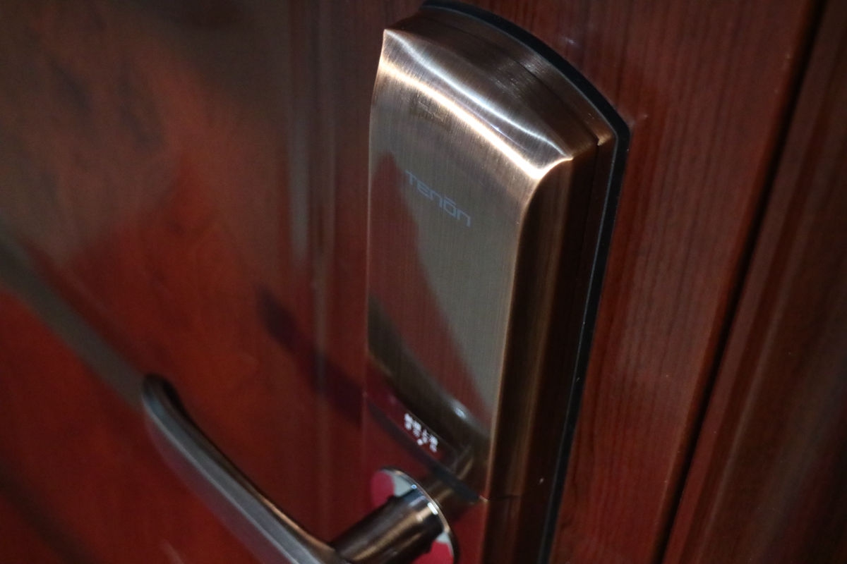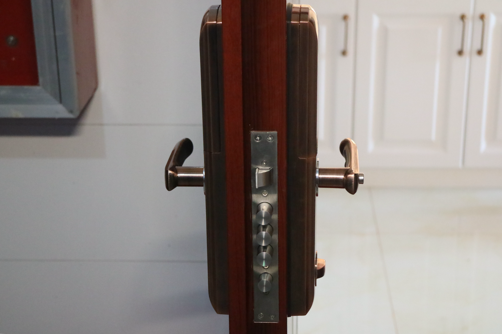 古铜色拉丝工艺的锁身光洁大气,非常耐看,很好地融入了环境,没有丝毫突兀,没有很多智能门锁的塑料感。