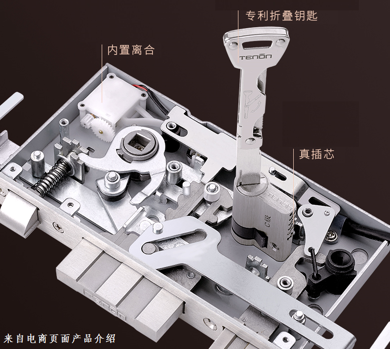 亚太天能T109采用了真插芯电子防盗锁体,电机和离合位于锁体内部。因为只有配置真插芯电子防盗锁体的智能锁,才能实现双重防撬,即使撬开门外面板,因有真插芯电子防盗锁体核心防护,也不能把门撬开。而市面上卖的智能锁,绝大部分都不是真插芯电子防盗锁体,所以仅有一重户外面板防撬,安全性大打折扣。