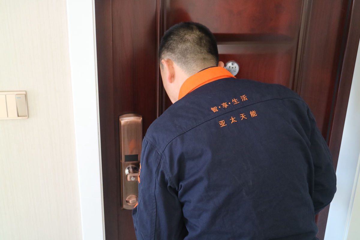 解析了亚太天能的双安全系统后,我们再回到安装。安装师傅在一个小时内就把整个智能门锁完全装好了。