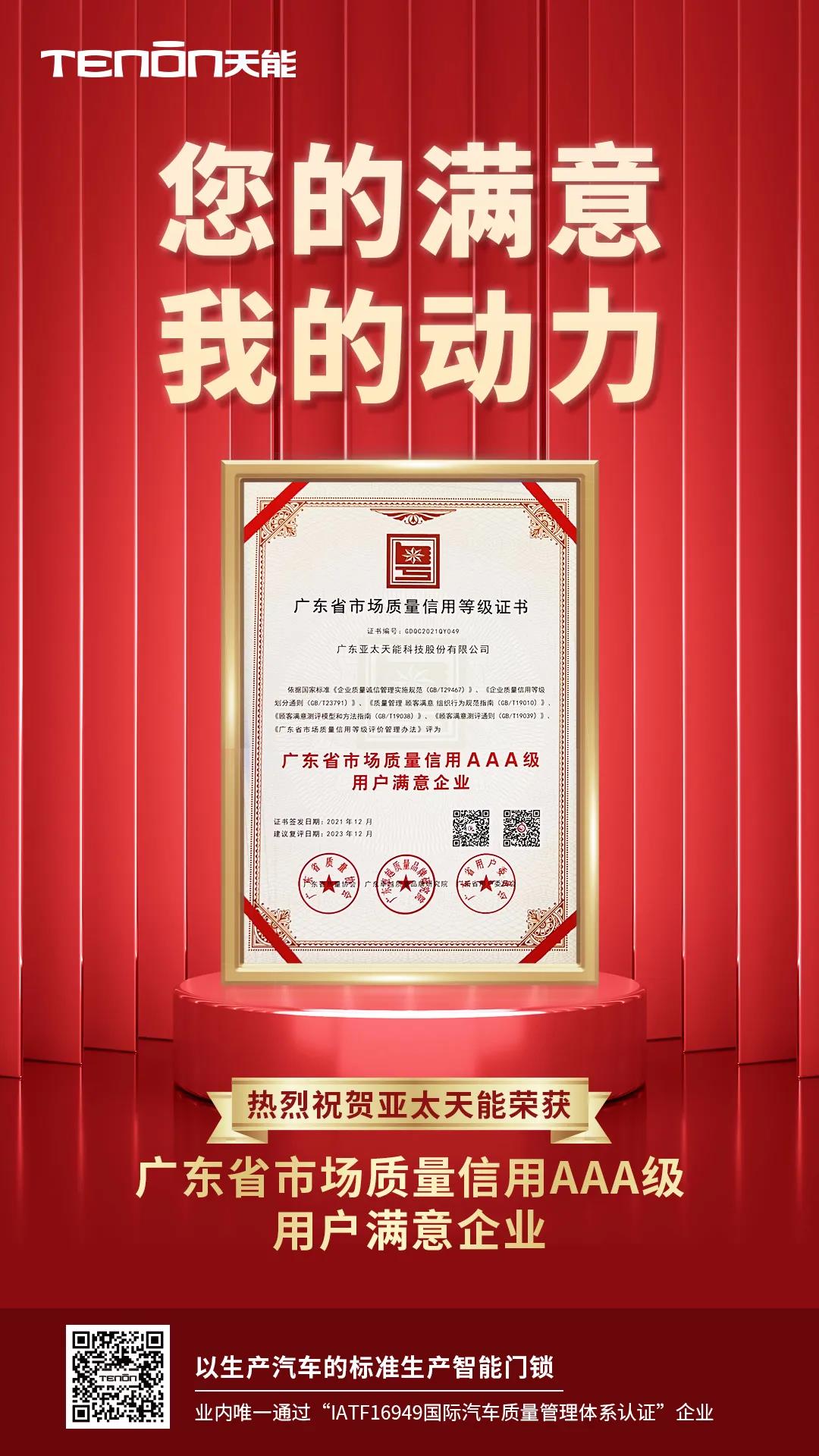 2021年12月,由广东省质量协会(以下简称“GDAQ”)、广东卓越质量品牌研究院、广东省用户委员会共同发起的市场质量信用评级中,广东亚太天能科技股份有限公司(以下简称“亚太天能”)凭借非凡的品牌声量与卓越的产品质量,以较高的满意度评分斩获“市场质量信用AAA级用户满意企业”殊荣。