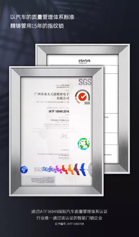 亚太天能作为业内唯一通过“IATF16949国际汽车质量管理体系认证”的企业,以生产汽车的高标准、高要求生产智能门锁,凭借严谨的质量管理体系,更是顺利获得全球权威检测机构Intertek 20万次无故障检测认证,远超行业标准19倍,从耐用性方面评估管用15年。