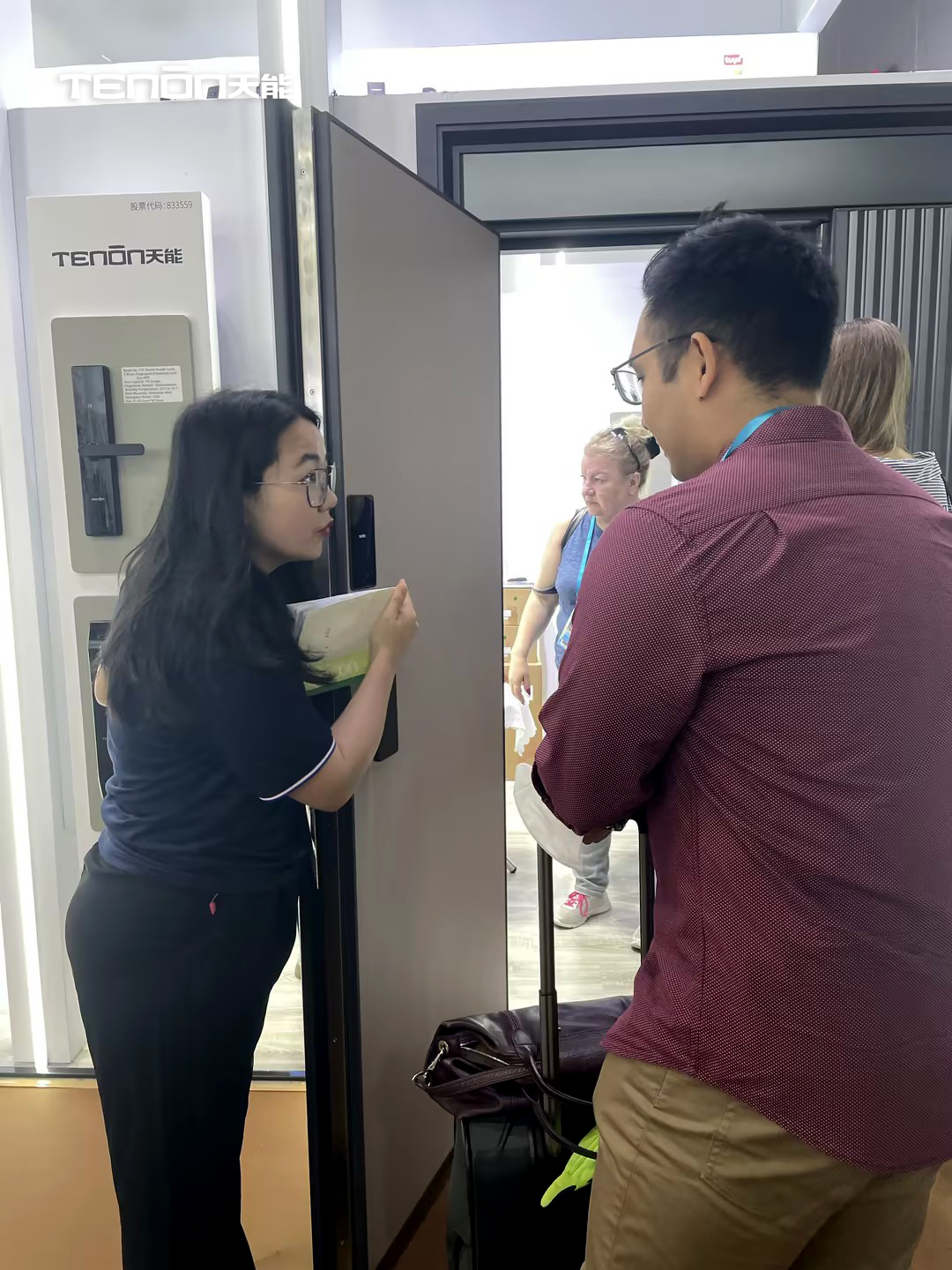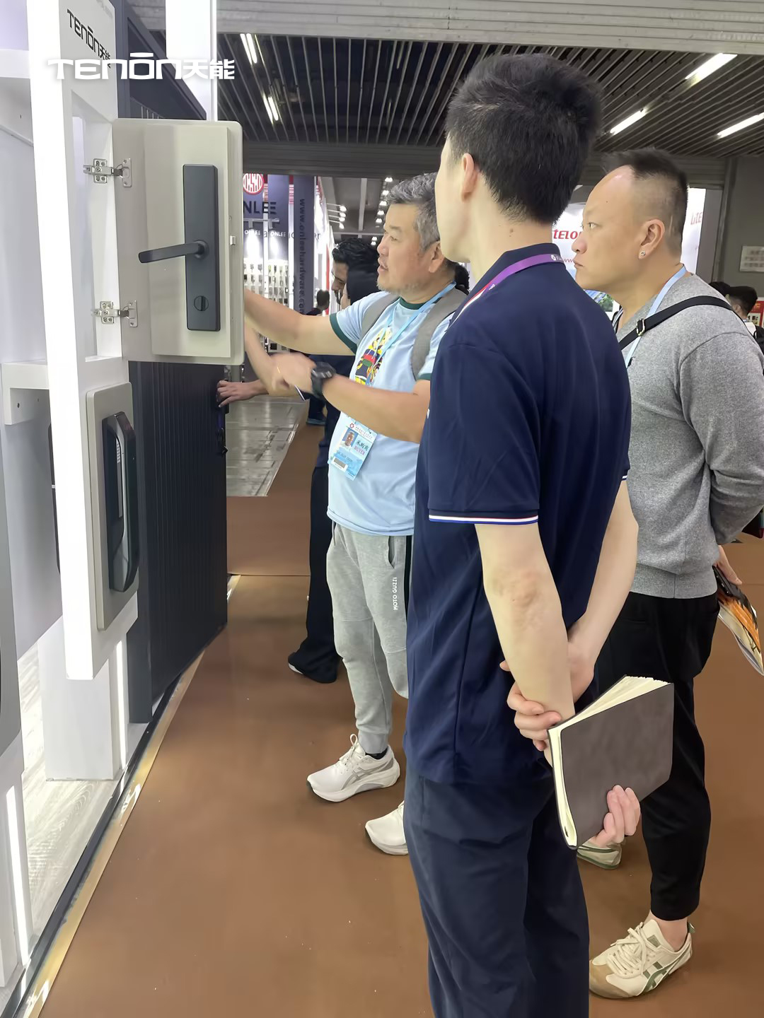 在展区另一个亮点之一是亚太天能的高端旗舰全自动智能锁A9x,引得不少观众纷纷询问产品的性能和特点。全自动智能锁A9x具备3D结构光人脸识别,先进的人体感应技术,能够自动感知用户的接近并自动解锁,无需繁琐的操作,致力让用户的生活更加高效便捷。并且还支持远程开锁和临时密码开锁,人体感应逗留报警功能等多项功能,全面提升用户居家生活体验及安全。