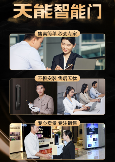 亚太天能为家装渠道合伙人提供了全方位立体式的无忧服务,让您与装企在合作过程中毫无后顾之忧。亚太天能智能门 2 个系列有 2000 多个组合,因此投资少占地小,不占资也不压货,真正实现了无压力合作经营。而且产品种类相对较少,学习起来轻松方便,家装渠道合伙人可以通过详情页、短视频以及直播间等多种途径迅速成为智能门销售专家。
