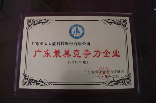 广东亚太天能科技股份有限公司凭借优质的产品质量和服务质量获得了2017年度“广东最具竞争力企业”和“广东最具竞争力品牌”双荣誉,展现出亚太天能在政府、业界、客户和社会公众中的标杆影响力!