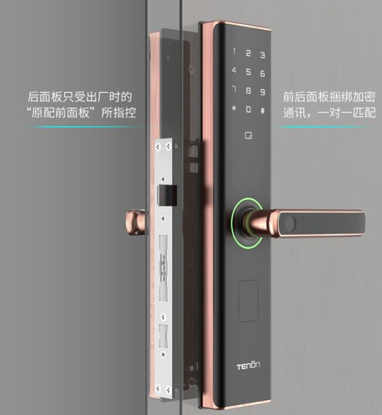 门里门外双控制系统,驱动开锁系统在后面板上,即使小偷破坏了前面板,也无法开启门锁,有效防电磁干扰解锁。