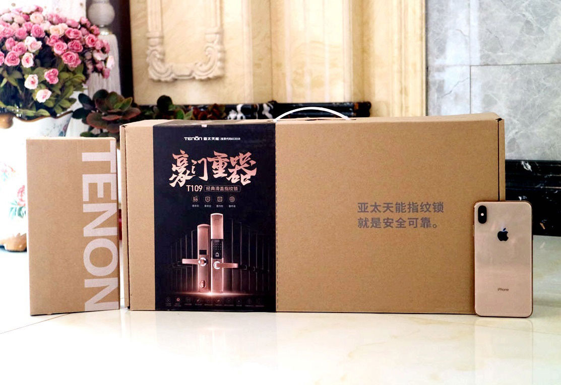在下单发货两天后,我们也很快收到了通过顺丰寄来的门锁包裹。在外层严密包裹下,是亚太天能T109手提式硬质纸箱,如图和iPhone XS Max做参照的话,这个体积不算大。设计上看上去的确比较大气,和市面一众偏年轻化数码产品的包装画风还是有些区别。同时,和很多一体化包装不同的是,亚太天能直接分开提供了两个包装盒,另外一个稍小的包装盒装的则是机械锁体。