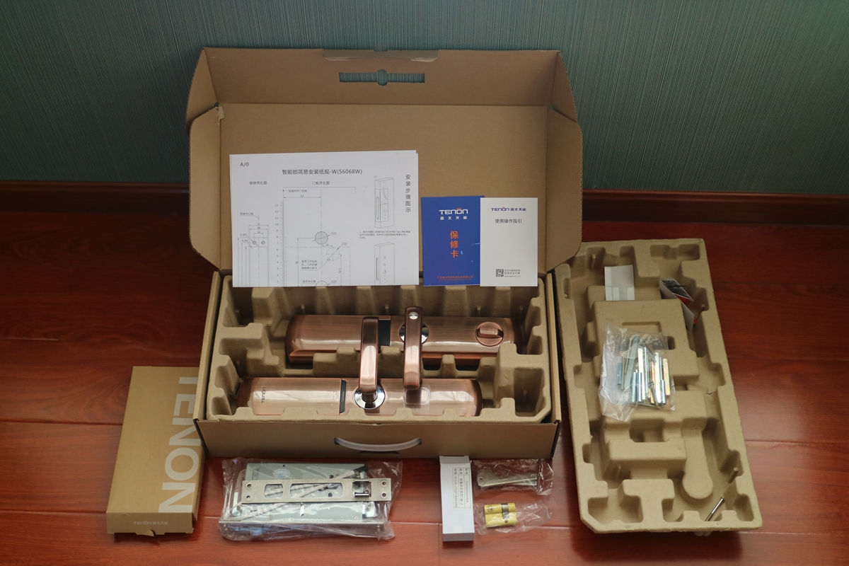 打开两个包装盒后可以发现,其他配件/附件等非常规整齐全。主包装盒内部并没有采用市面常见的严重污染环境的泡沫塑料进行固定,而是采用成本更高的定制化硬纸托固定,环保大气。前后两个智能门锁锁身也分别采用了无纺布进行包裹,拉开无纺布后能看到光洁的锁身。