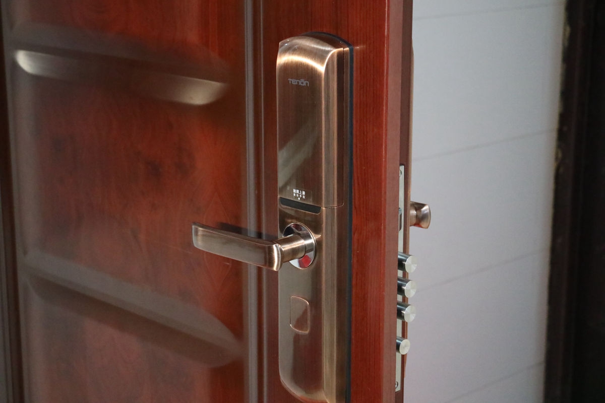 除此之外,我们还从安装师傅口中还了解到,亚太天能T109还针对极端火灾状况做出了极其严苛的防护设计。据悉亚太天能的锁体能够适配98%的门,在安装锁体时只需要用到门上的两个小孔,不会破坏防火门的安装等级。同时锁体内部都装配有不锈钢材质的防火底板,即使火灾来临,不锈钢底板也起到很好的隔绝火焰和浓烟的效果,防止室内抢火的现象。亚太天能这种极端条件下的安全防护设计在市面智能门锁产品里极为罕见,市面上很多锁都会在安装时直接把门锁钻掉,这样既破坏了门原来的结构,还会有安全危险,特别火灾时候。这款T109前后全金属外壳的结构,能在火灾来临时,比市面上大多数采用塑料外壳的智能锁多了一份安全保护。