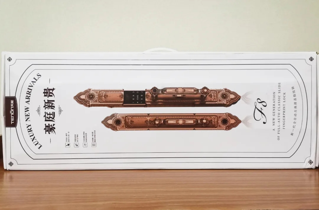 刚入手亚太天能F8全自动古典智能锁的第一感觉就是“重”,外包装为长方体,因为F8锁体长度比很多家用智能锁长,所以重量也会比一般家用智能锁重。