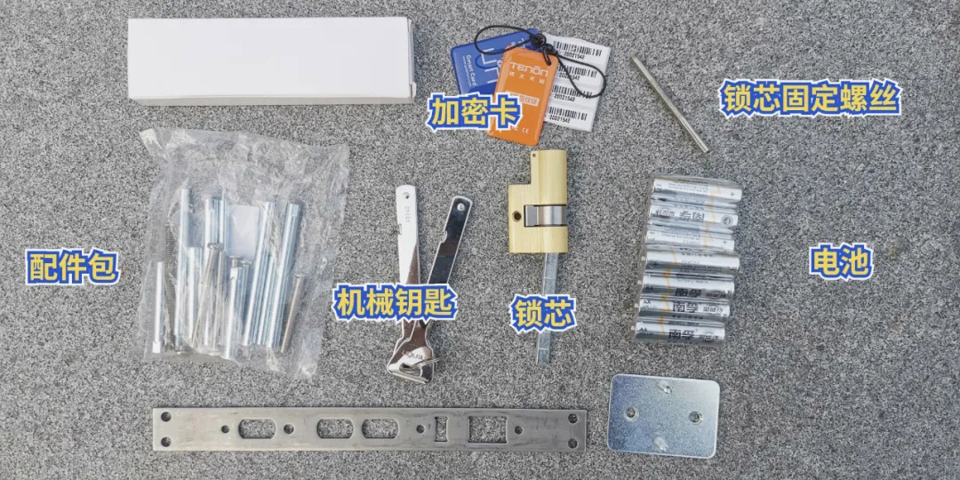 第二层是配件层,主要包含了锁体、安装零件包、卡片、锁芯、机械钥匙、电池、使用说明书等等。