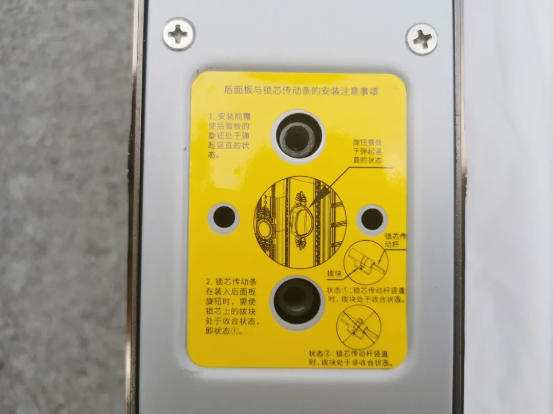 后面板中部还附有后面板与锁芯传动条的安装注意事项黄色贴纸。