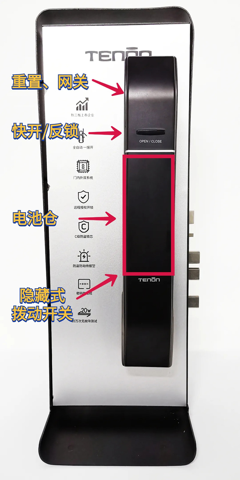 亚太天能A7x后面板从上至下依次为重置和网关区、快开/反锁按键、电池仓、隐藏式拨动开关。